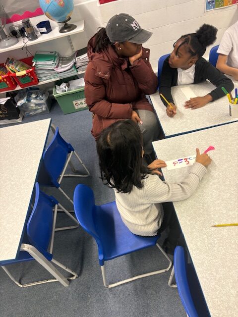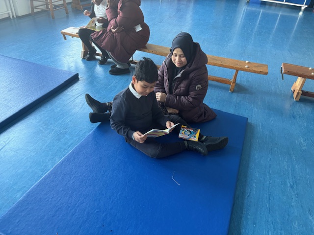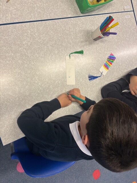 Parents came to help their child choose two books to keep and make a bookmark to take home.