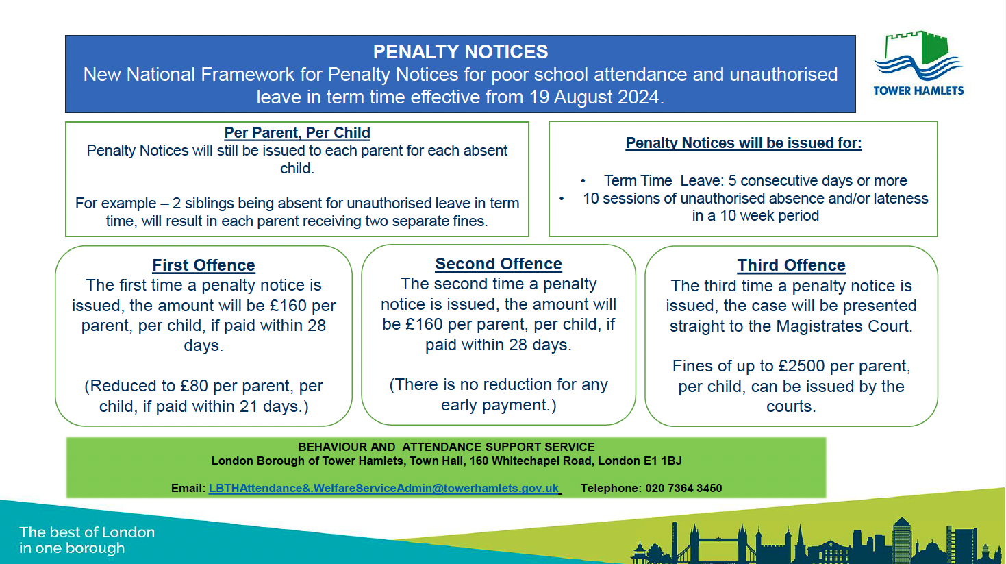 Please be reminded that five days of unauthorised absences will result in a penalty notice referral to the local authority and may lead to a £160 fine per child, per parent.